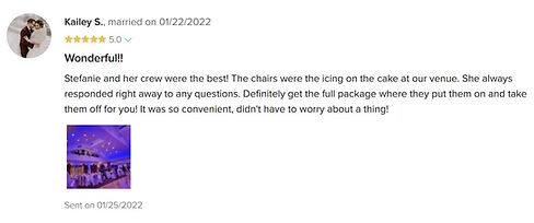 Stefanie was a wonderful person to work with from the very start! I first booked her for a Photobooth for my wedding then she came to my rescue and helped me with all my chair linens! She is professional, genuine, reliable, and is very eas...y to keep in contact with! I would highly recommend Chic Chair Cover Boutique for any event!! You couldn't pick a better person to work with! Thank you Stefanie I sincerely appreciate all you did for us on our special day!-Nicole Marie Treib